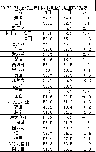 2017年5月全球主要國家和地區(qū)制造業(yè)PMI指數(shù)